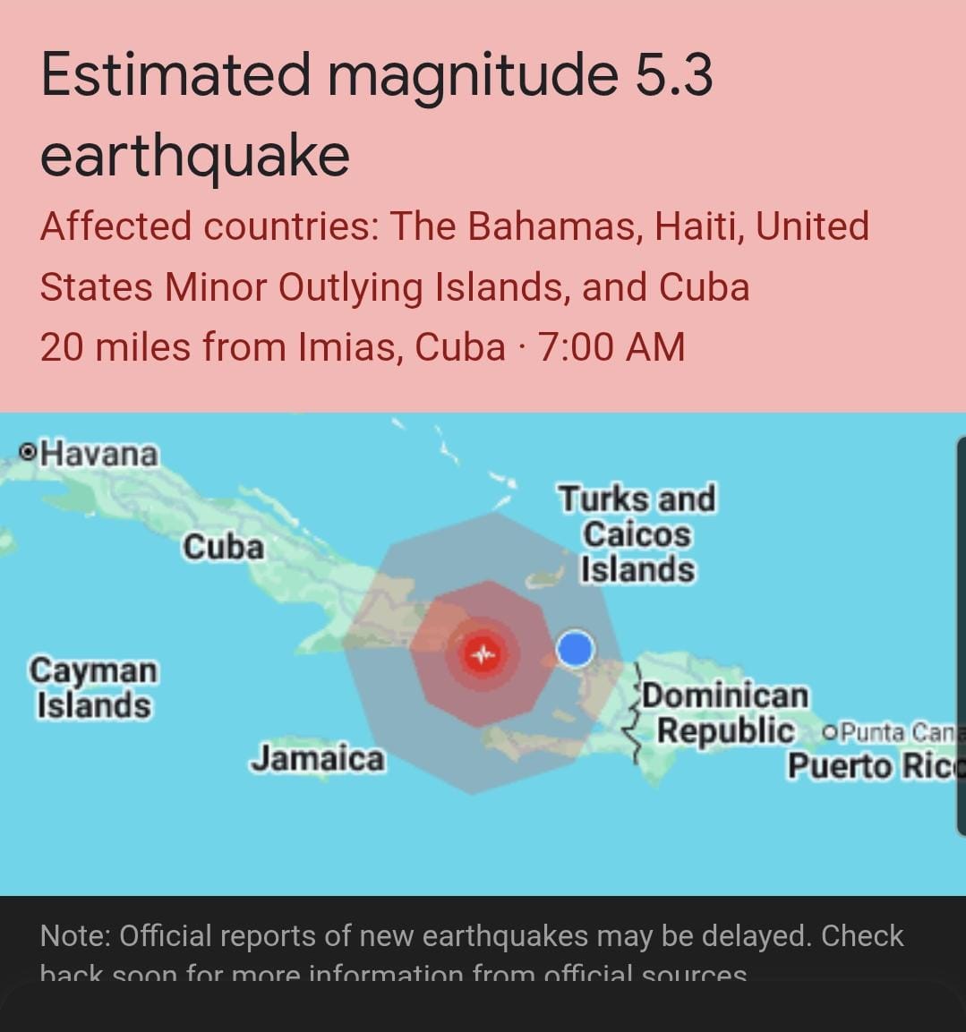 AAn earthquake with a magnitude of 5.3 was recorded this Sunday morning around 7:00 a.m. near Imías, Cuba, approximately 20 miles (32 km) from the epicenter.
